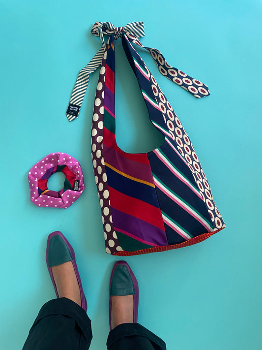 "Absolutely love my tie bag! I have gotten so many compliments and it has become my go-to. It's especially great when shopping as it is spacey enough to tuck stuff inside but also has an inner pocket to keep my wallet handy. I love it so much and the unique colors make it the best accessory!"